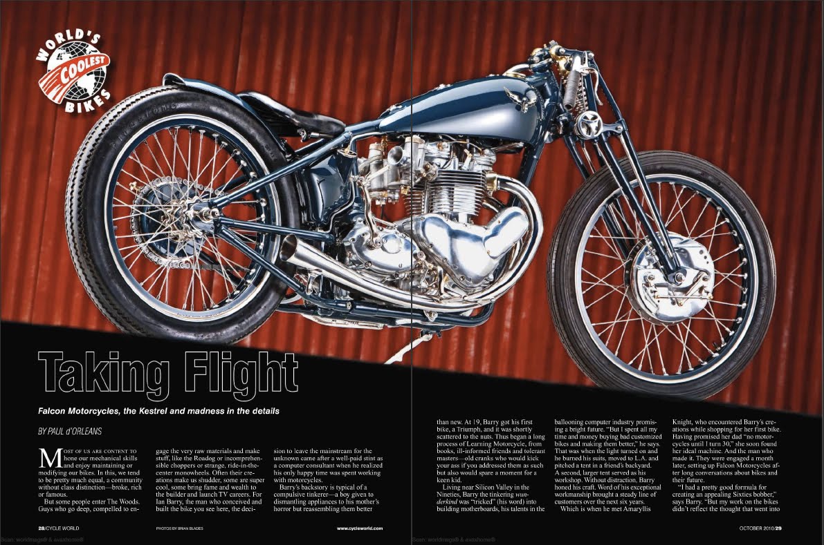 The October edition of Cycle World magazine is out in print, and includes my review of Falcon Motorcycle's 'Kestrel', as part of CW's 'World's Coolest Bikes' series. Thanks to editor in chief Mark Hoyer for including the piece in this issue, and for a skilled editing job (most instructive, actually, how a few minor tweaks can integrate my florid writing style to the 'feel' of a modern motorcycle mag).